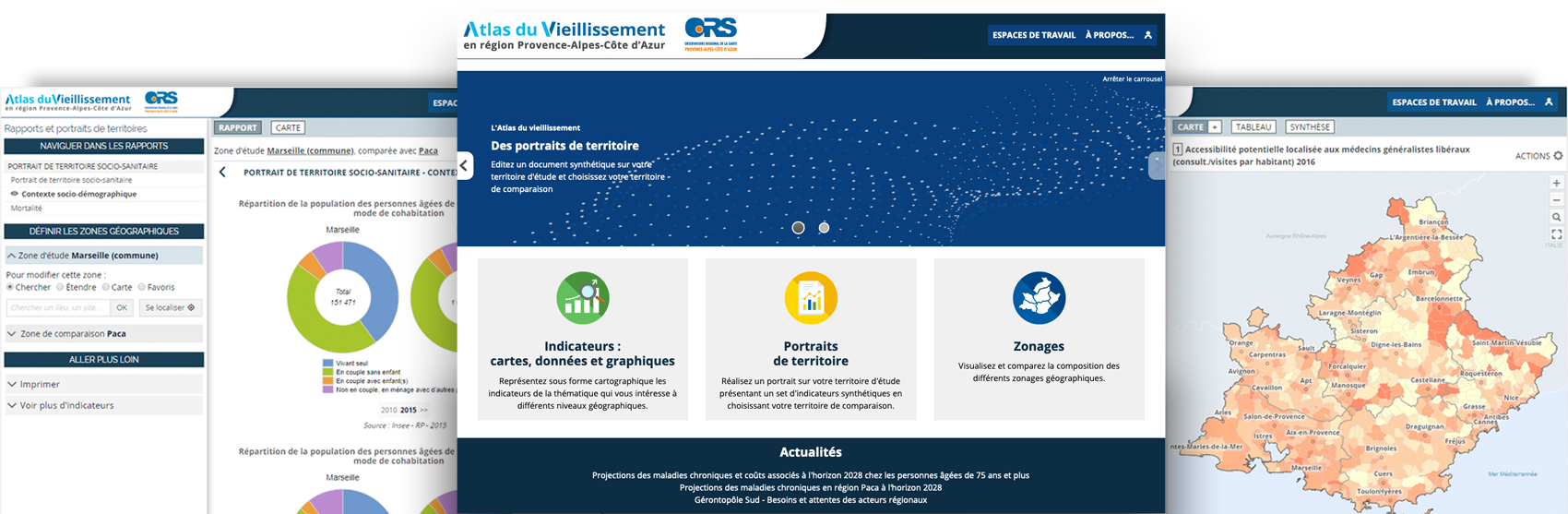 Le développement de l’Atlas du vieillissement par l’Observatoire régional de la santé grâce au soutien financier de l’Agence régionale de santé et de la Région Sud Provence-Alpes-Côte d’Azur s’inscrit dans ce cadre. Les indicateurs socio-économiques (isolement, pauvreté, aides sociales…), sanitaires (état de santé déclaré, niveau de dépendance estimé…) et d’offre de soins (offre libérale…) seront enrichis en continu notamment par des indicateurs sur les recours aux soins, les dispositifs intégrés dans les filières gériatriques…).