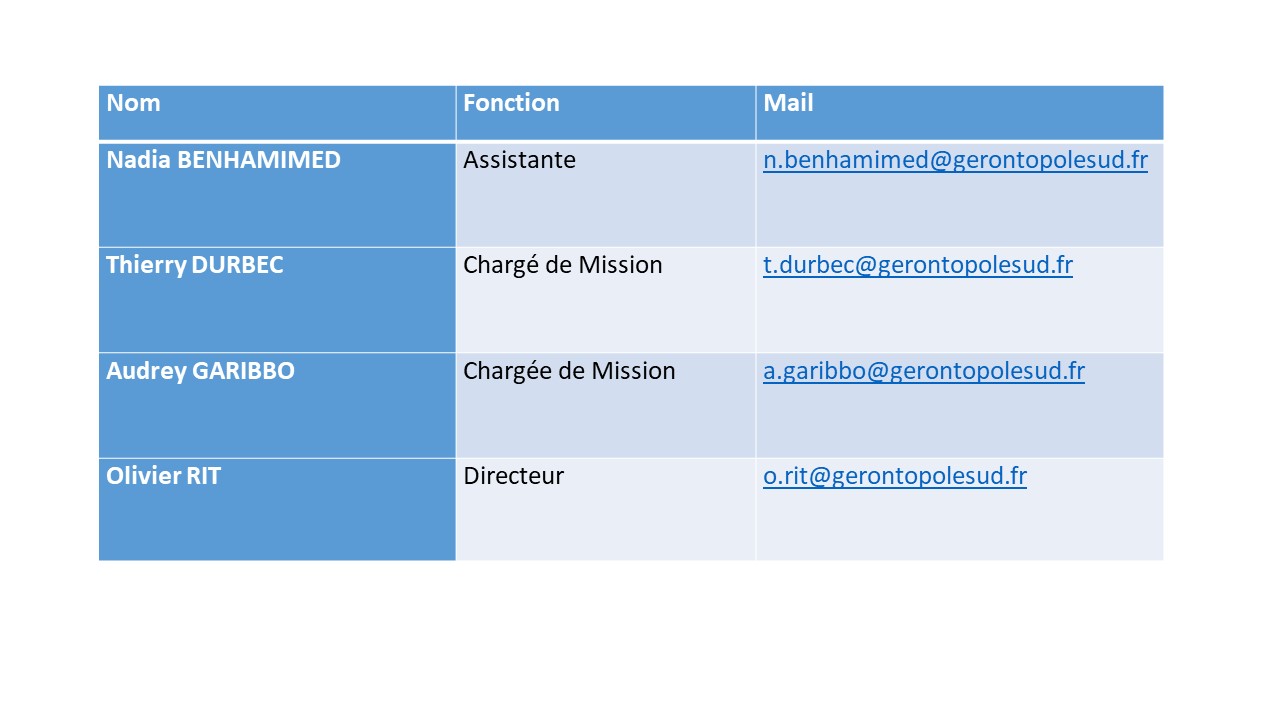 L'équipeFrédéricRodriguesDirecteur LolaGomisChargée de mission : Silver économie, Innovation & Développement territorial BérengèreDavin-CasalenaIngénieure de Recherche MéganeContiResponsable Communication SarahRibeiroAssistante de direction Membres du bureauJosyChambonPrésidentePr. OlivierGuérinVice-présidentPr. Anne LaureCoudercVice-présidenteMichelPerrotTrésorierFlorenceArnouxSecrétaire du bureau