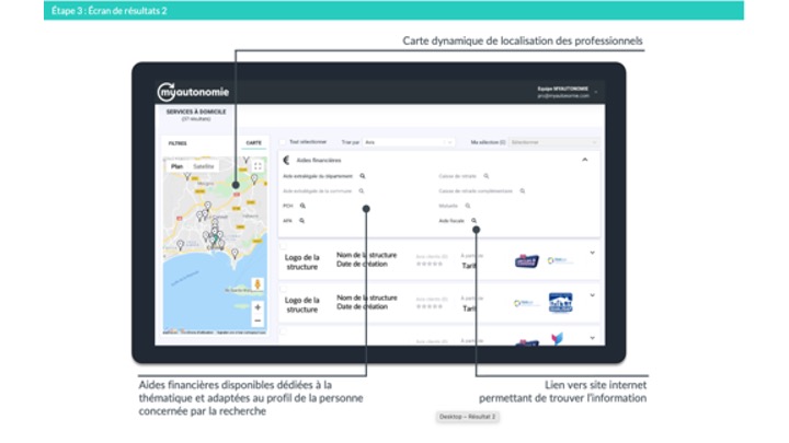 Un écran d’accueil permet de compléter la recherche (la situation du bénéficiaire, son âge, son isolement, …), le résultat est ensuite présenté sous forme de liste et peut être filtré par thématique ou par situation géographique. Ce résultat comporte le nom de la structure et ses coordonnées mais également une indication tarifaire, les mentions concernant la démarche qualité ainsi qu’un système de notation sécurisé.