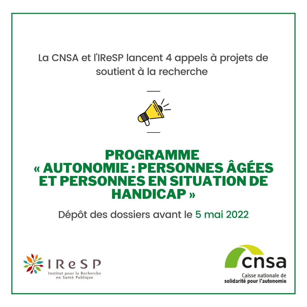 La CNSA et l’IReSP lancent l‘édition 2022 du programme de soutien à la recherche « Autonomie : personnes âgées et personnes en situation de handicap ».